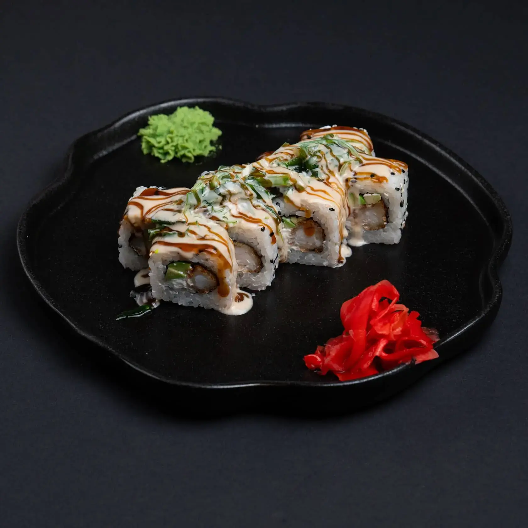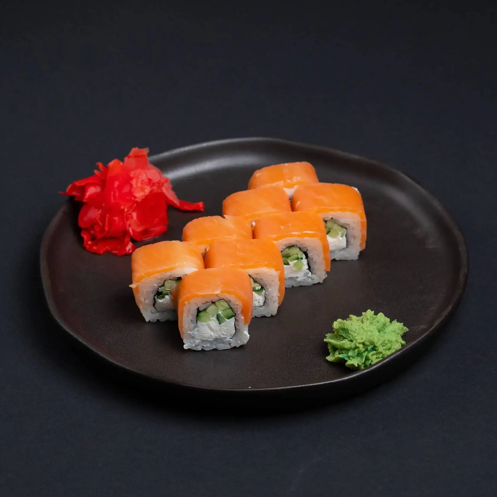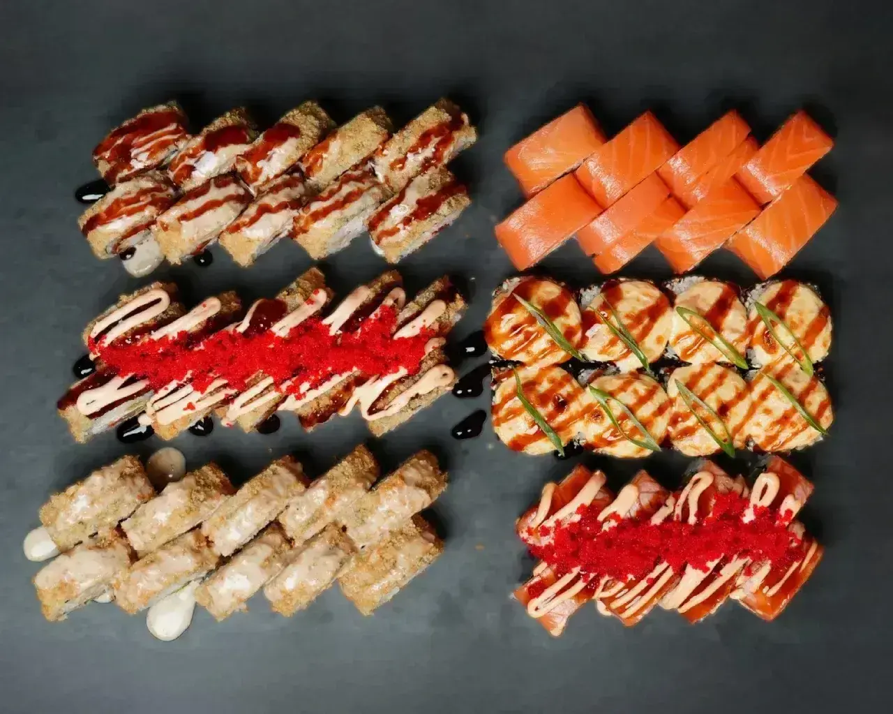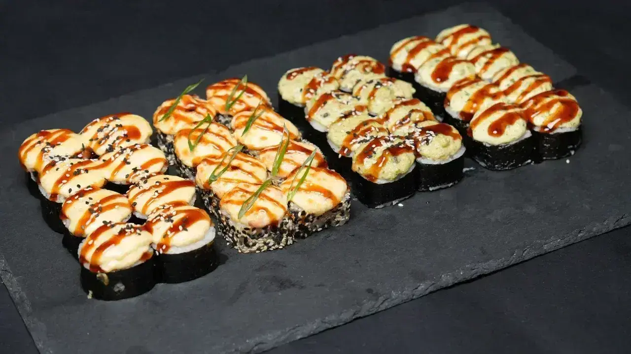 Филадельфия Ча, Йонака с копченой курицей, Цезарь с курицей, Калифорния с креветкой, Токио запеченный с курицей, Калифорния с лососем, Узумаки запеченный с курицей и угрем, Горячий шик 68 штук / 2,5 кг