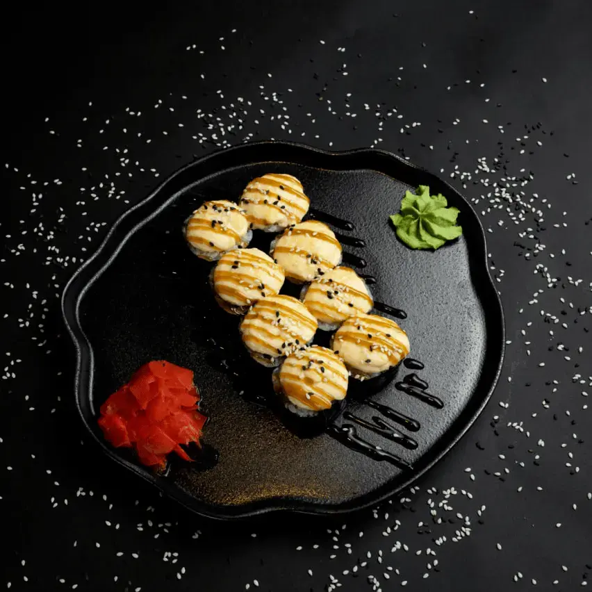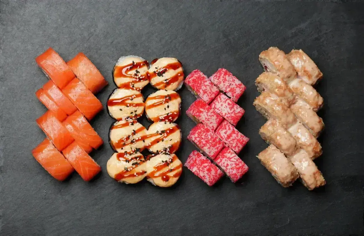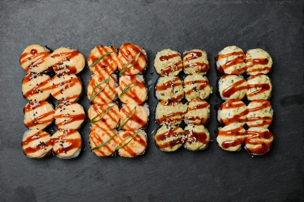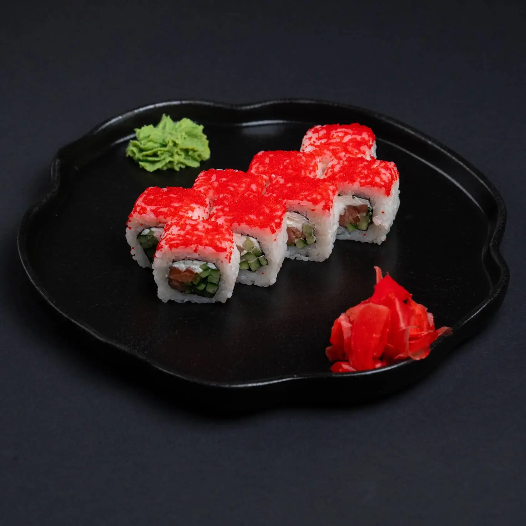 Филадельфия Ча, Йонака с копченой курицей, Цезарь с курицей, Калифорния с креветкой, Токио запеченный с курицей, Калифорния с лососем, Узумаки запеченный с курицей и угрем, Горячий шик 68 штук / 2,5 кг
