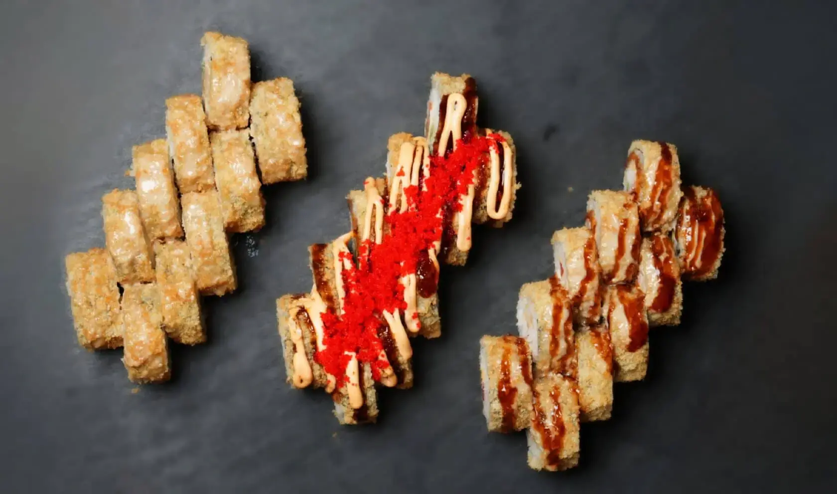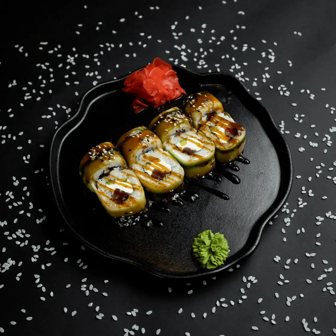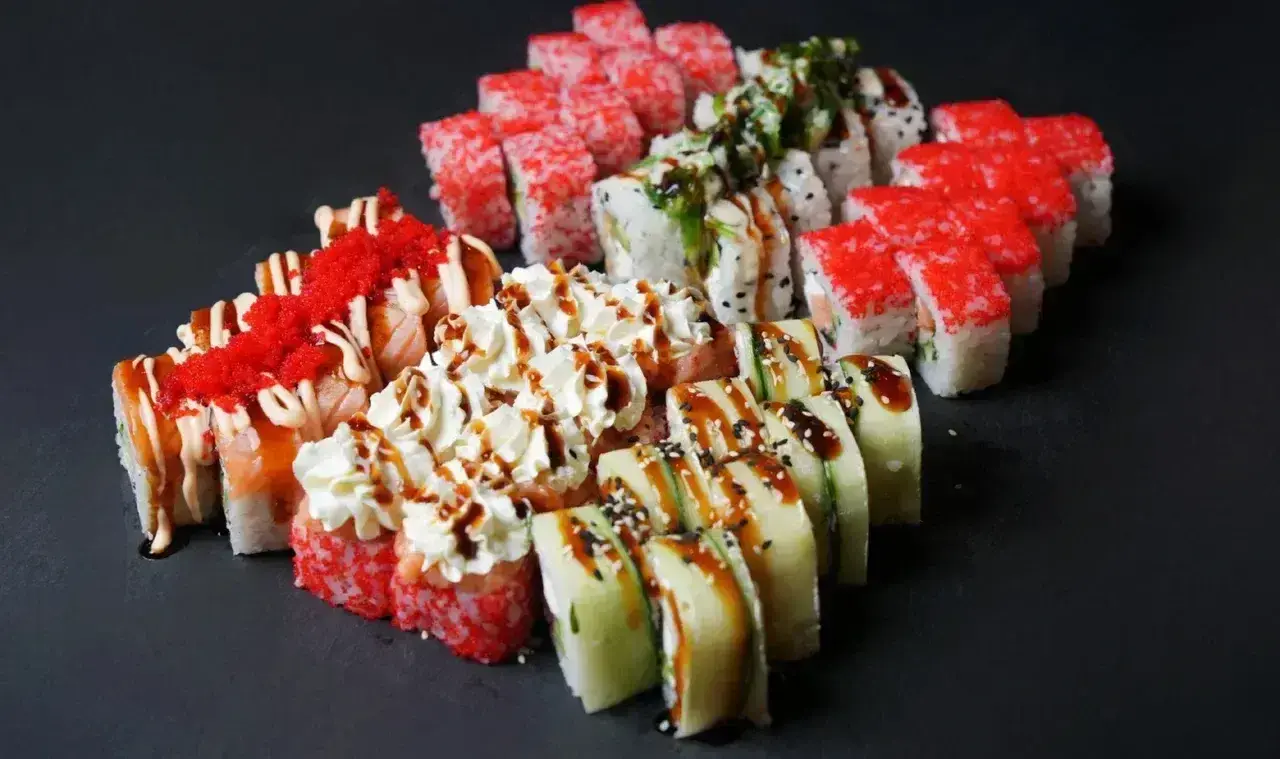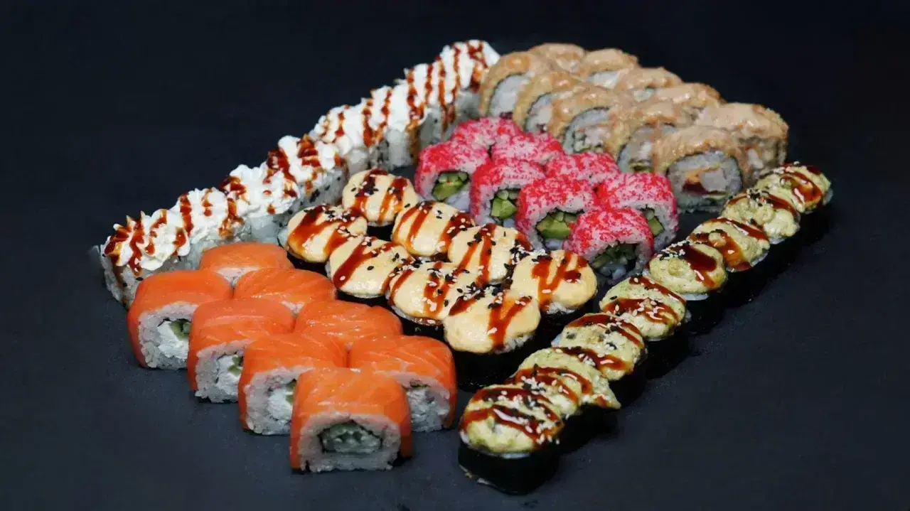 Филадельфия Ча, Йонака с копченой курицей, Цезарь с курицей, Калифорния с креветкой, Токио запеченный с курицей, Калифорния с лососем, Узумаки запеченный с курицей и угрем, Горячий шик 68 штук / 2,5 кг