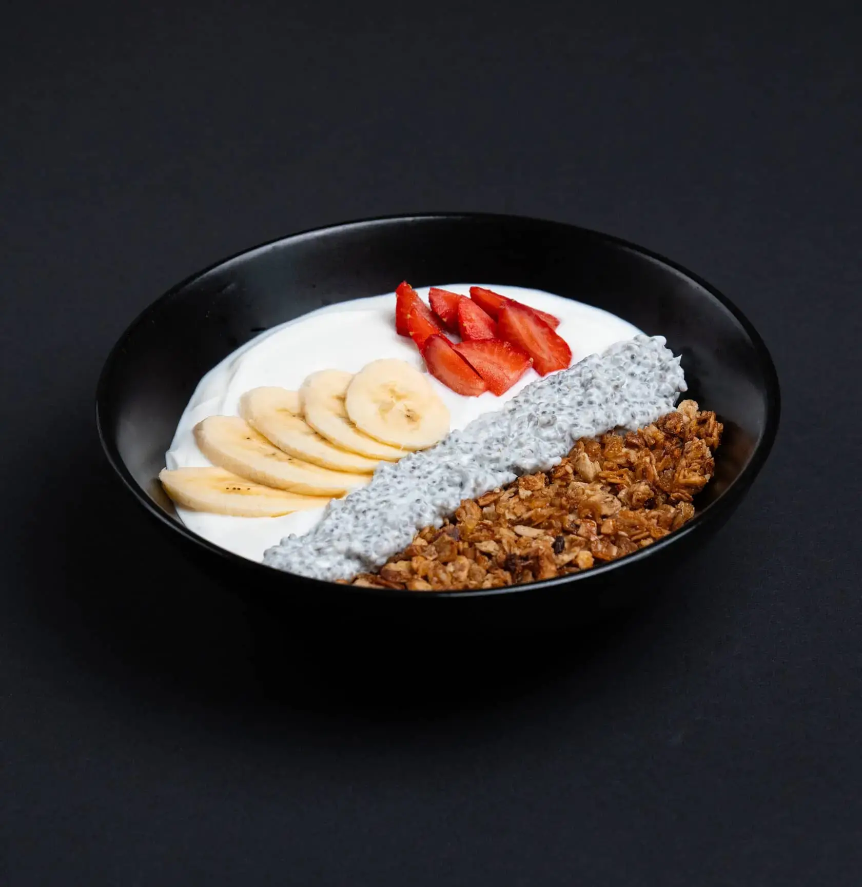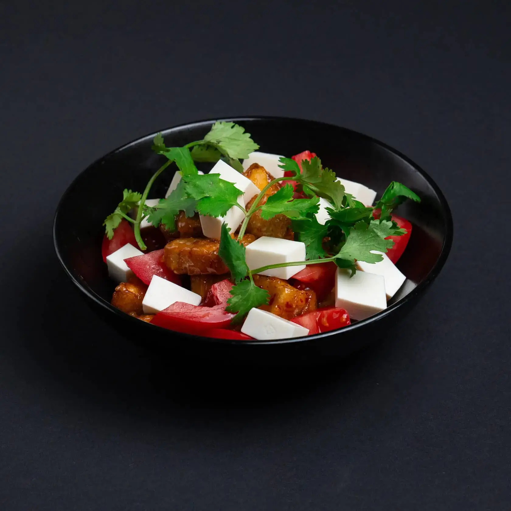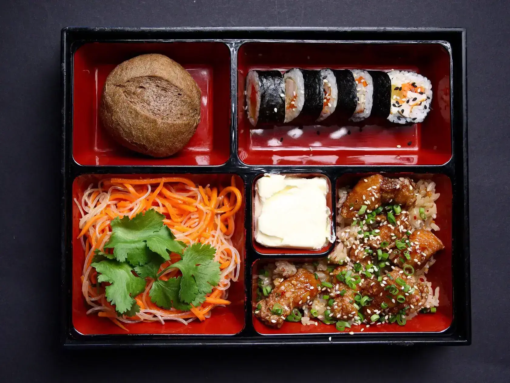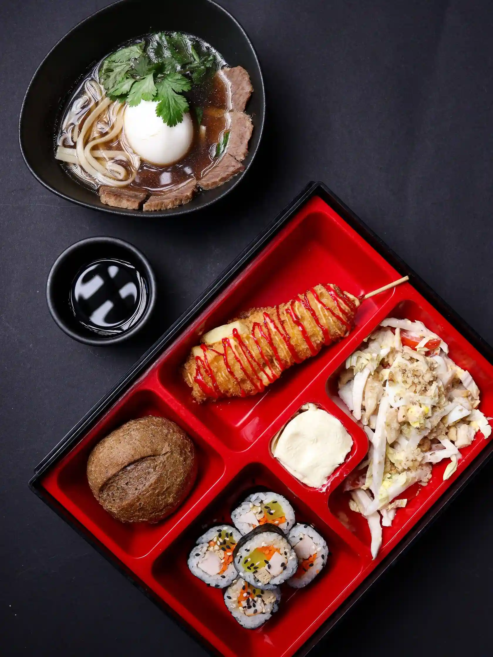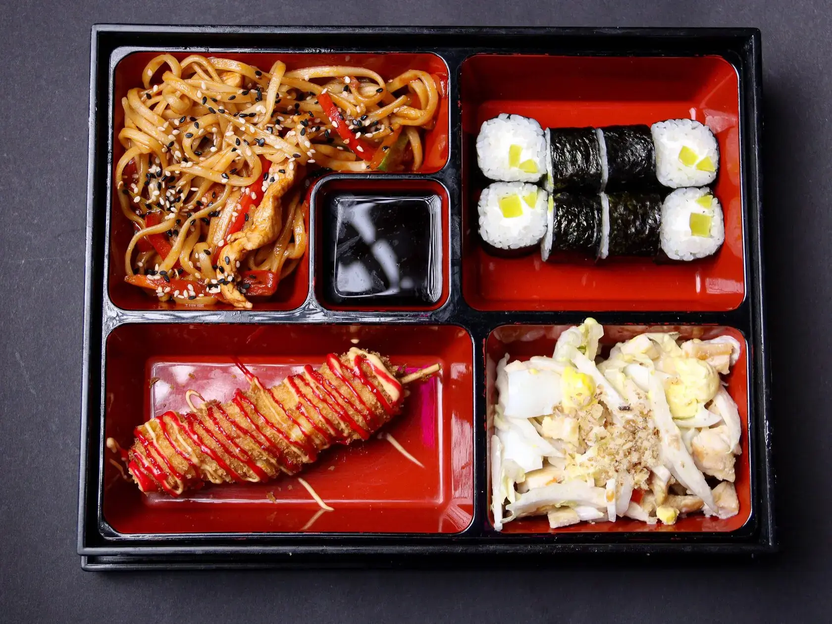 Сбалансированное и яркое блюдо с копчённой курицей, маринованный редис, набор овощей, морковь по-корейски, яйцо, рис и грибы шиитаке подается с острым соусом