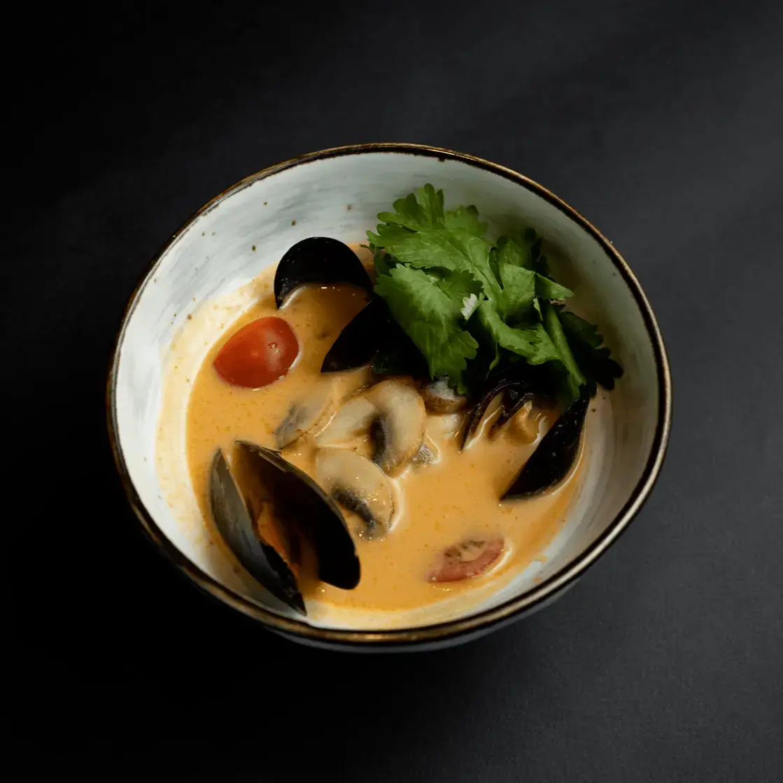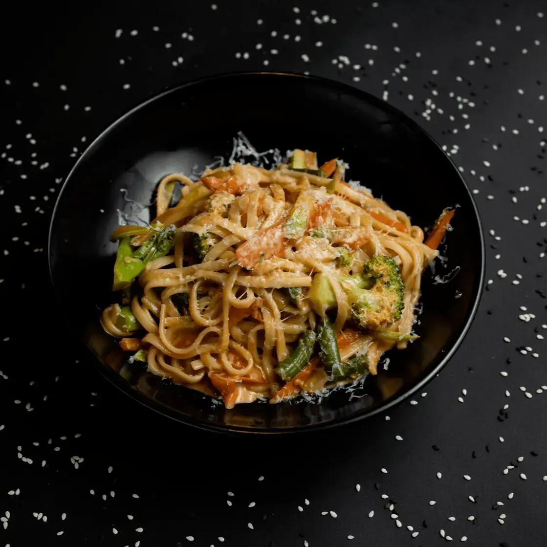 Насыщенный сырный бульон с лапшой, нежным цыпленком, грибами эноками, кукурузой, зелёным луком, кунжутом и маринованном яйцом