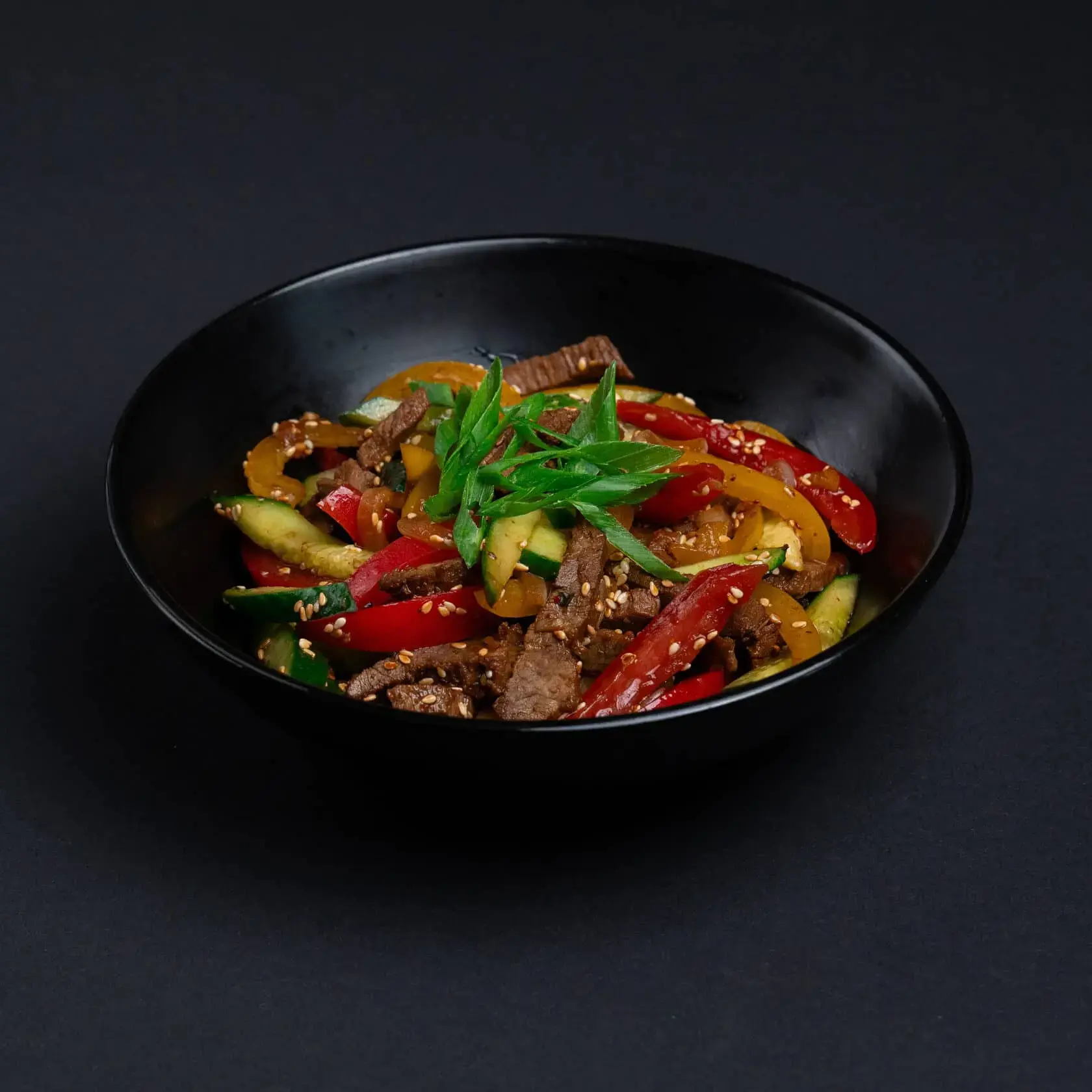Сбалансированное и яркое блюдо с говядиной, маринованный редис, помидор черри, огурец, морковь по-корейски, яйцо, рис и грибы шиитаке под соусом унаги, посыпанные кунжутом подается с острым соусом