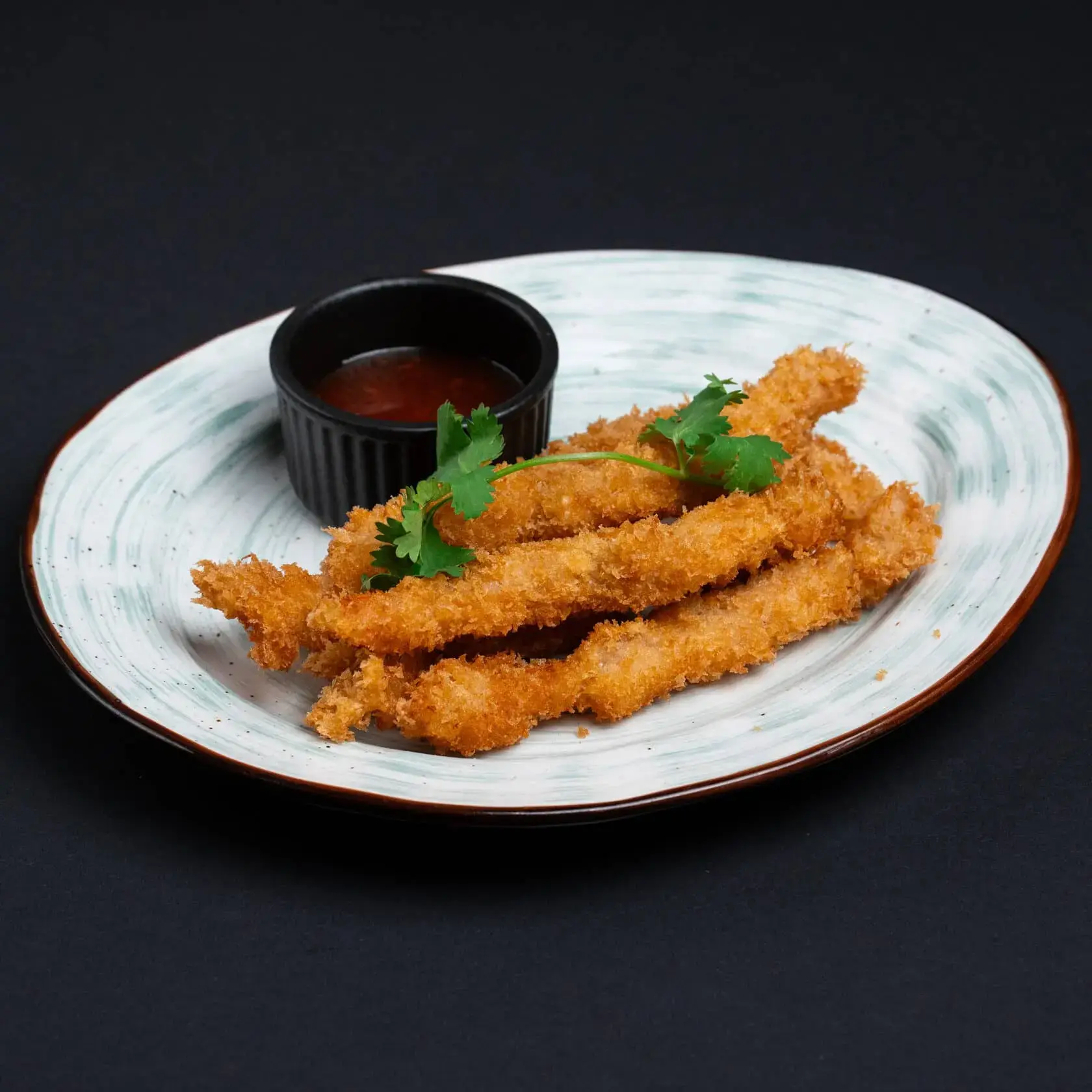 Хрустящие кусочки цыпленка, покрытые глазурью с рисом в кисло-сладком соусе, посыпанные зелёным луком и кунжутом, культовое блюдо корейской кухни
