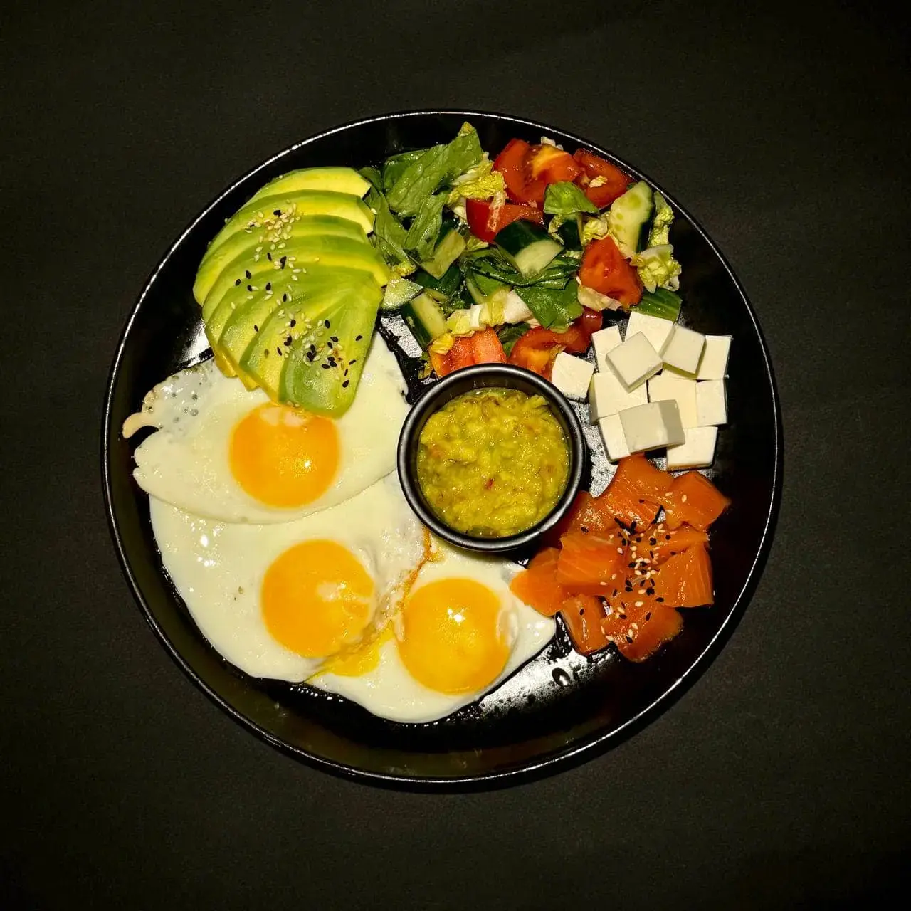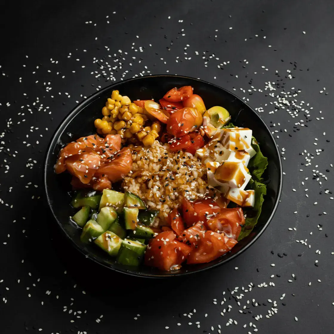 Сбалансированное и яркое блюдо с тигровой креветкой, маринованный редис, помидор черри, огурец, морковь по-корейски, яйцо, рис и грибы шиитаке под соусом унаги, посыпанные кунжутом подается с острым соусом
