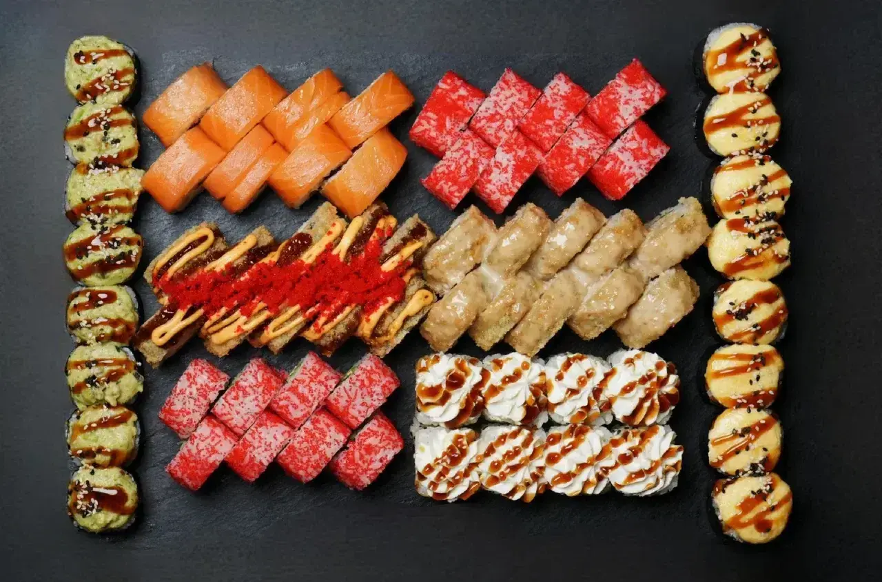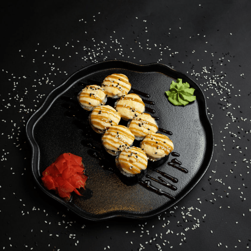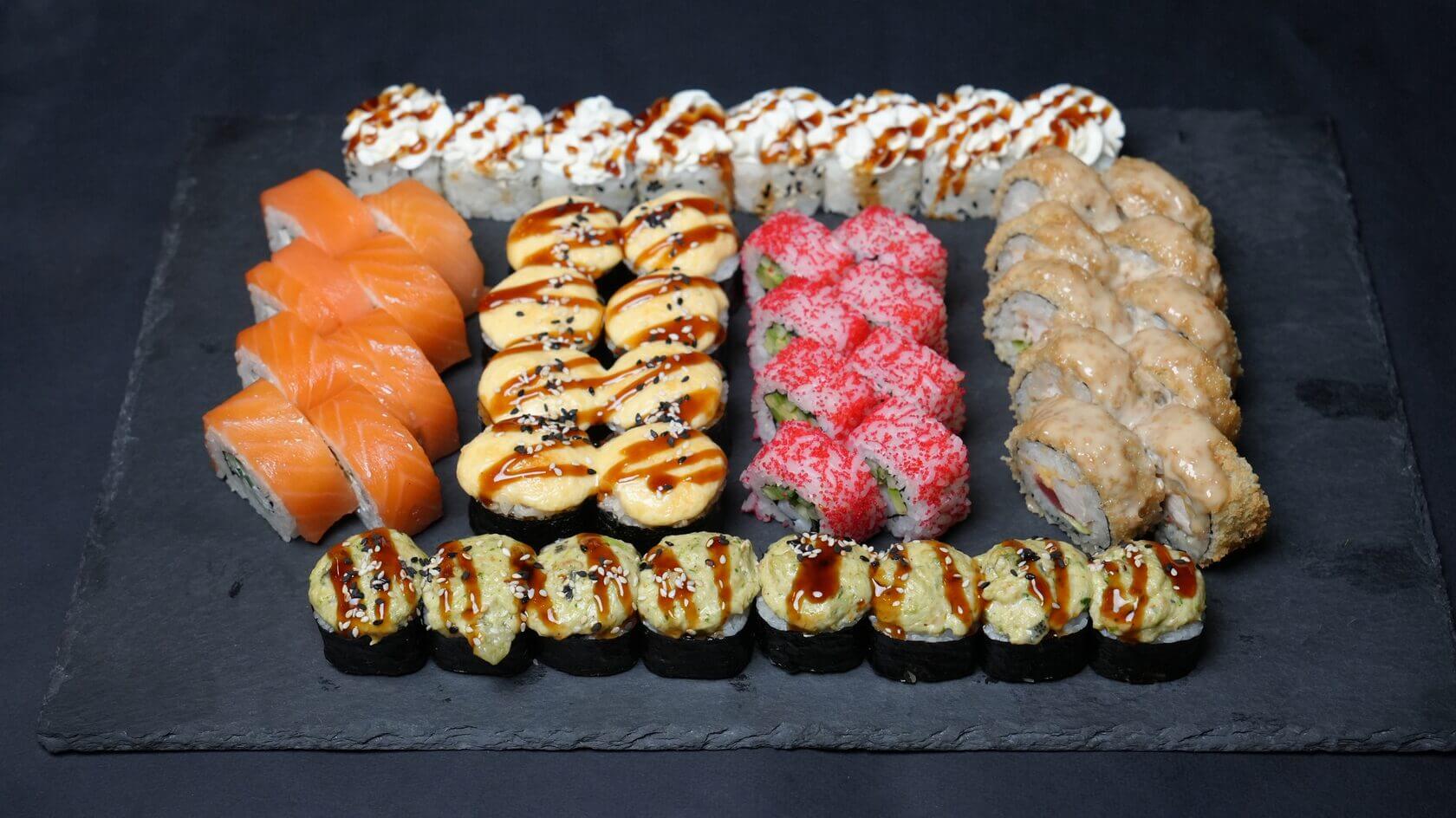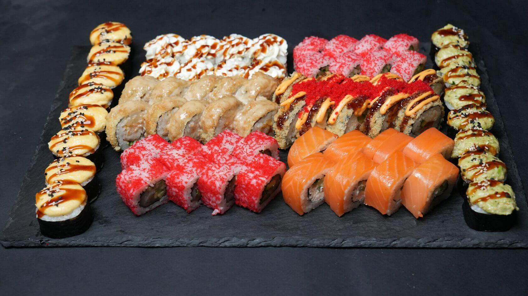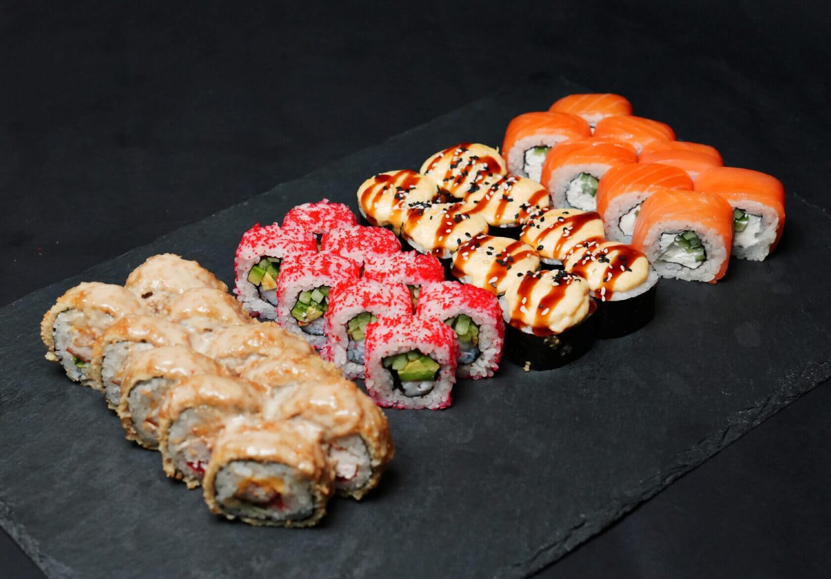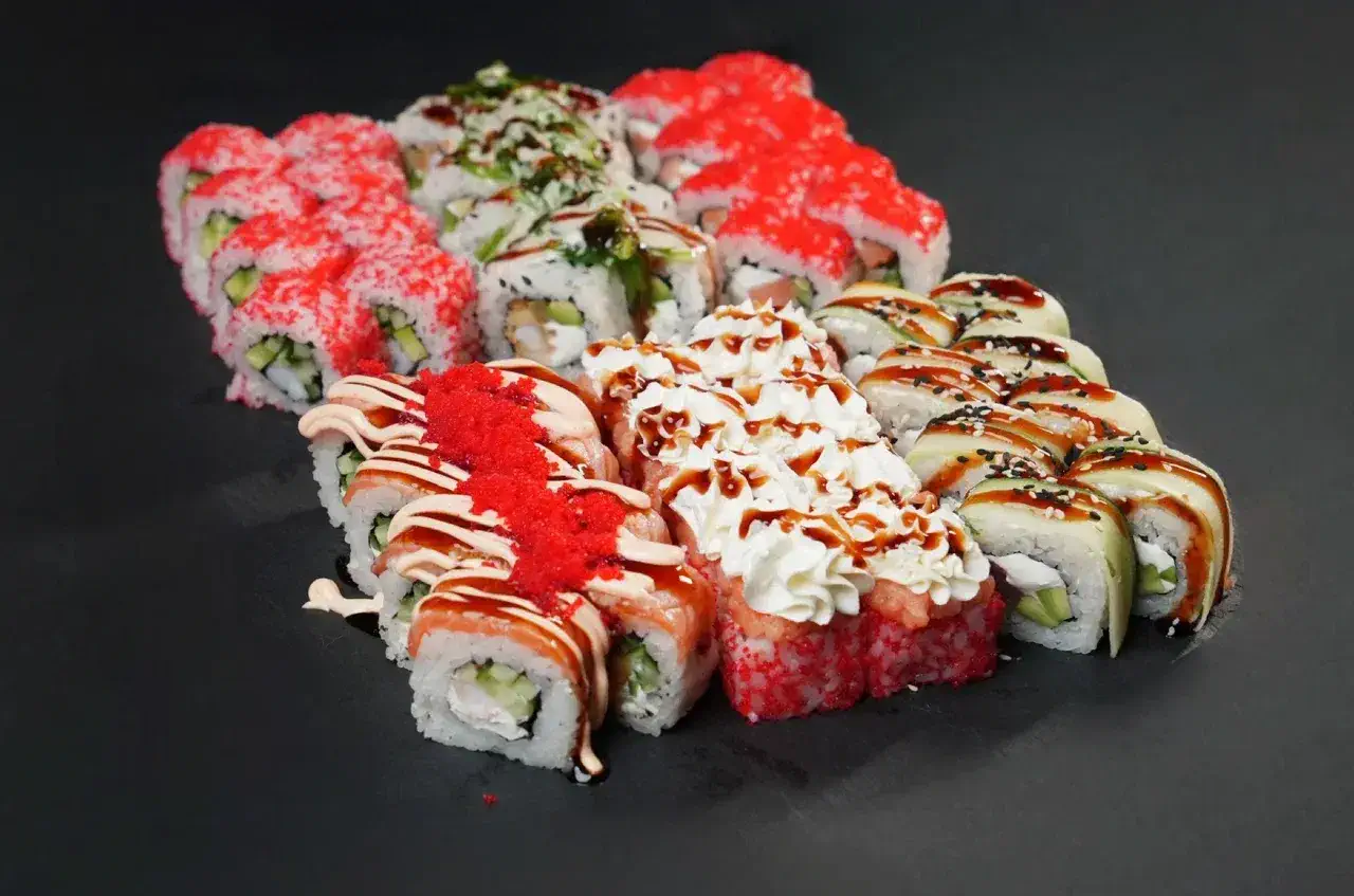 Филадельфия Ча, Йонака с копченой курицей, Цезарь с курицей, Калифорния с креветкой, Токио запеченный с курицей, Калифорния с лососем, Узумаки запеченный с курицей и угрем, Горячий шик 68 штук / 2,5 кг