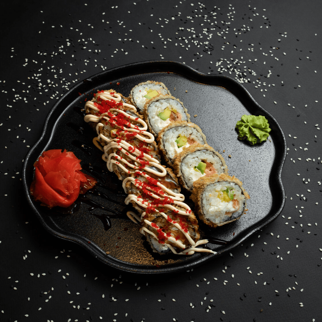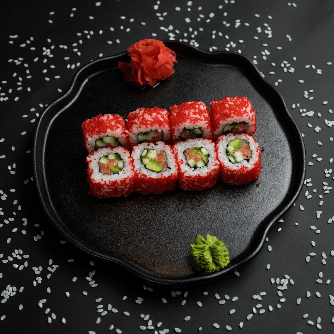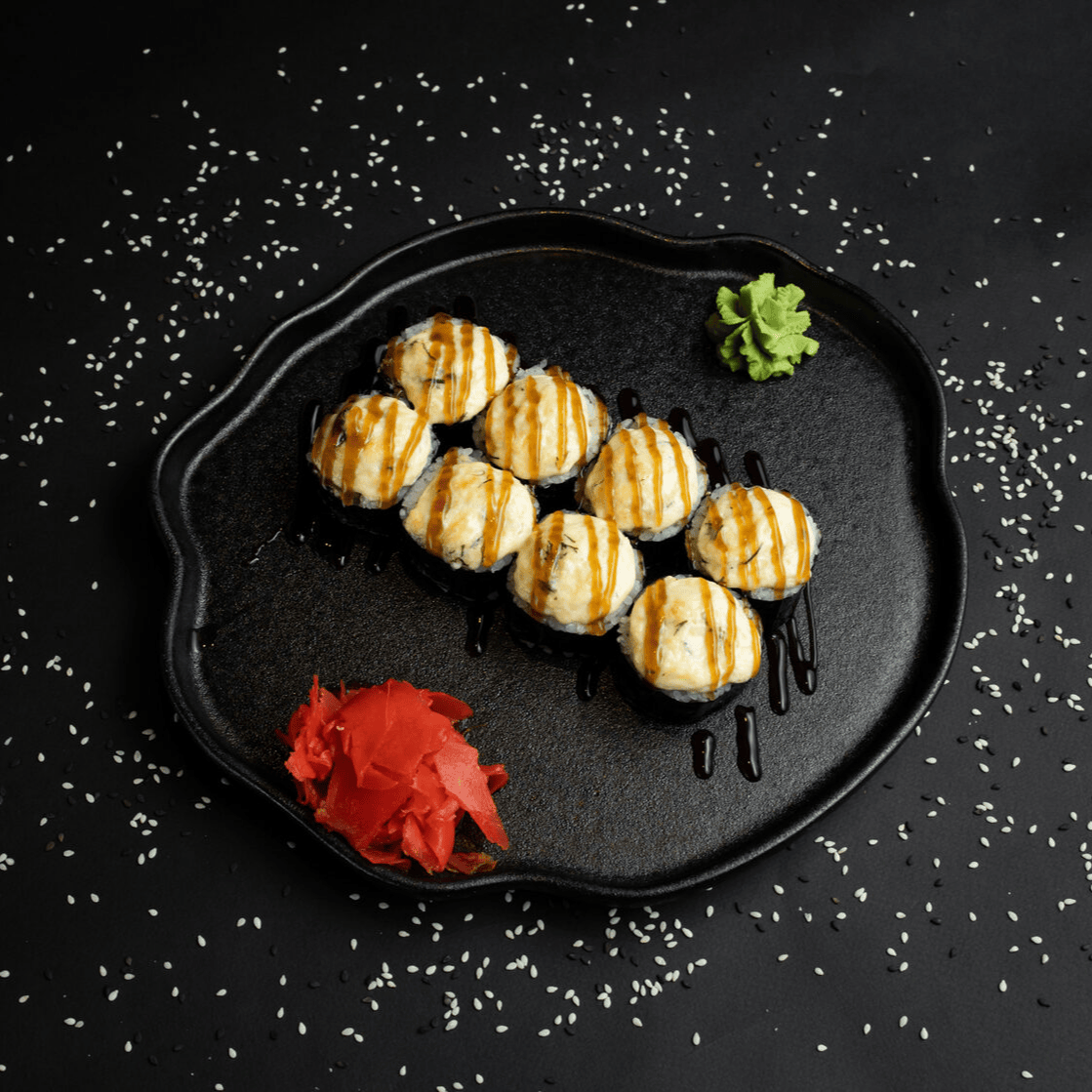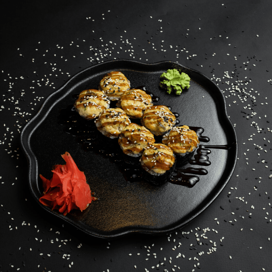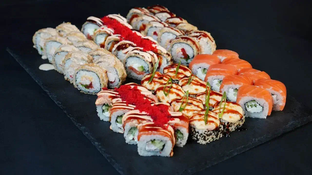 Филадельфия Ча, Йонака с копченой курицей, Цезарь с курицей, Калифорния с креветкой, Токио запеченный с курицей, Калифорния с лососем, Узумаки запеченный с курицей и угрем, Горячий шик 68 штук / 2,5 кг