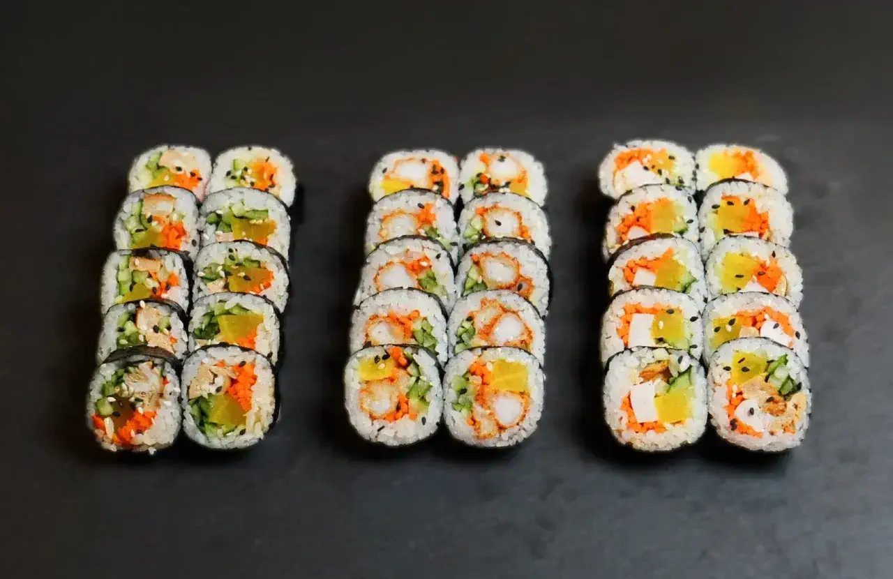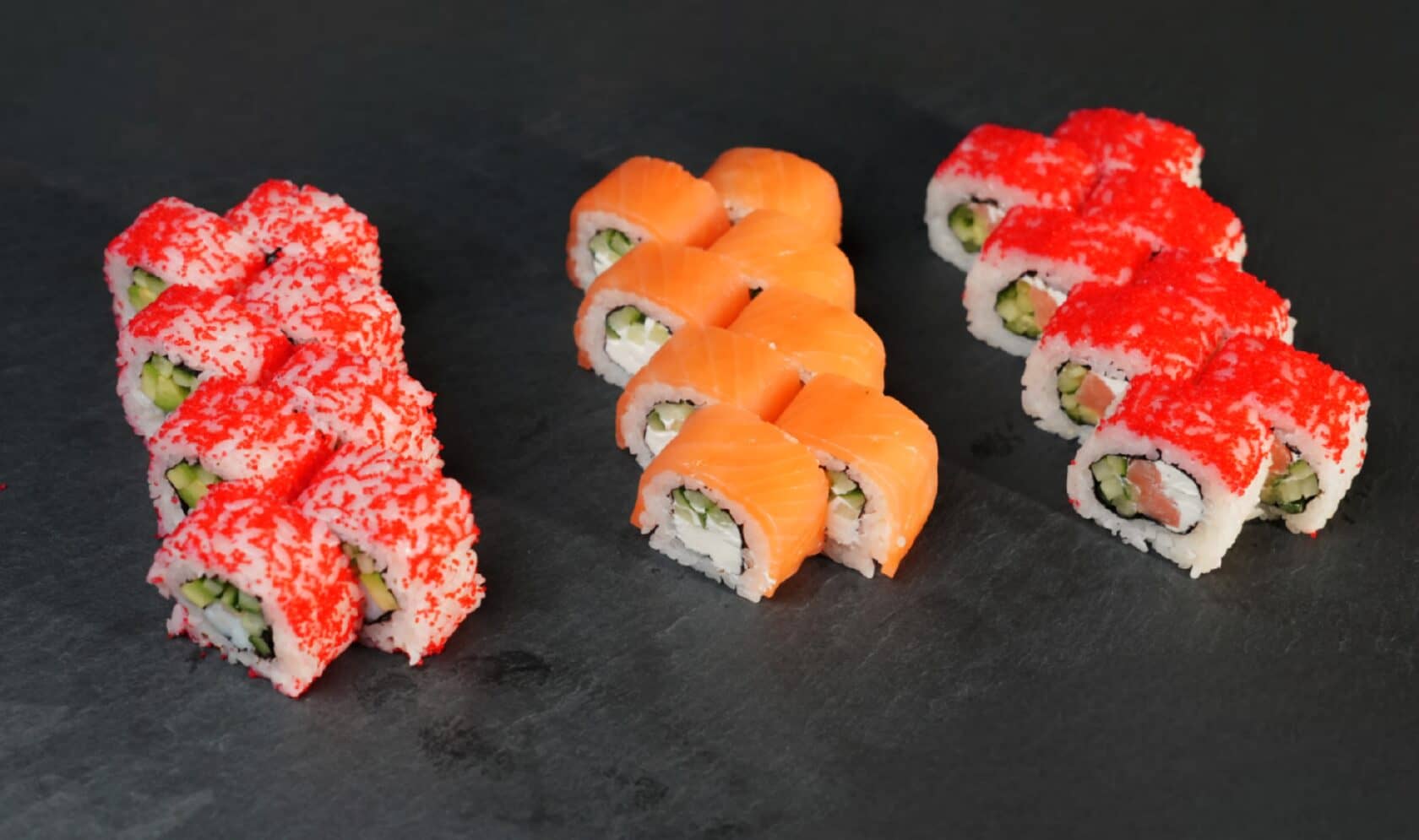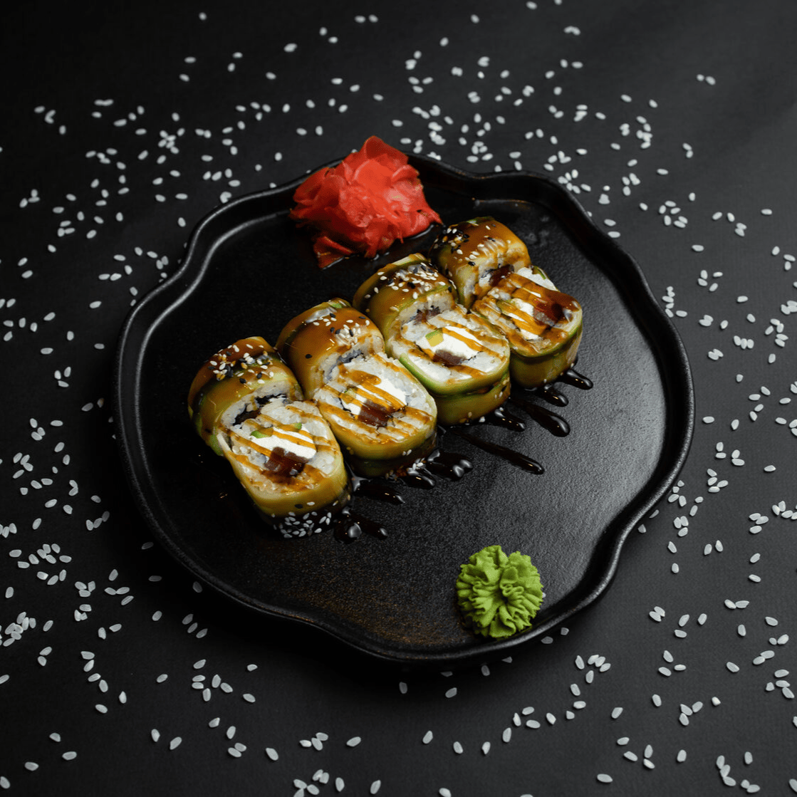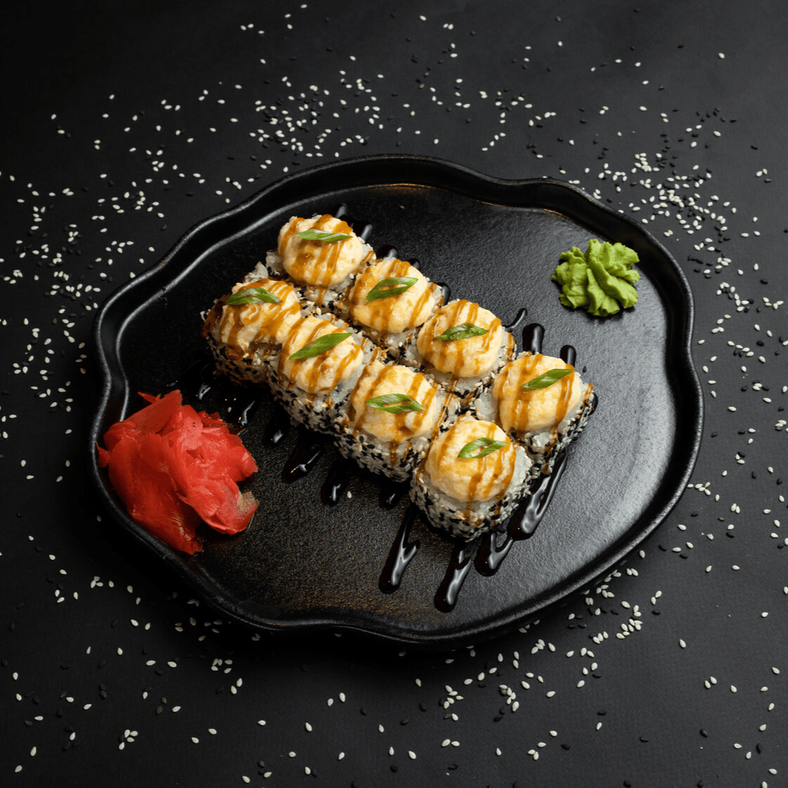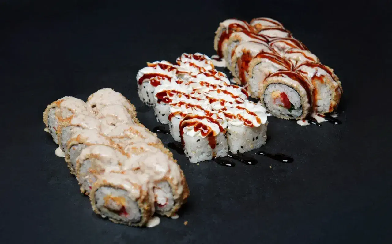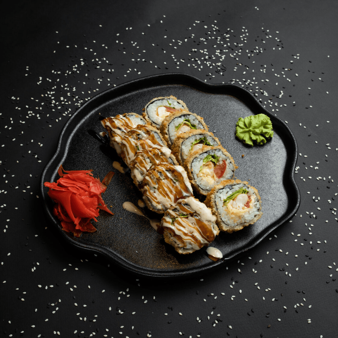 Филадельфия Ча, Йонака с копченой курицей, Цезарь с курицей, Калифорния с креветкой, Токио запеченный с курицей, Калифорния с лососем, Узумаки запеченный с курицей и угрем, Горячий шик 68 штук / 2,5 кг