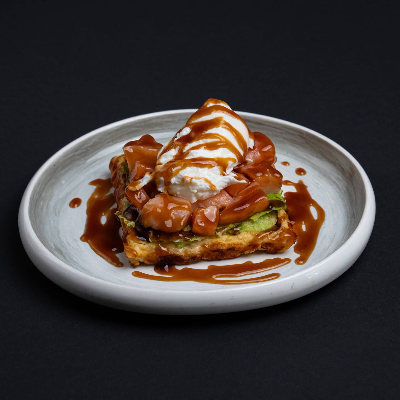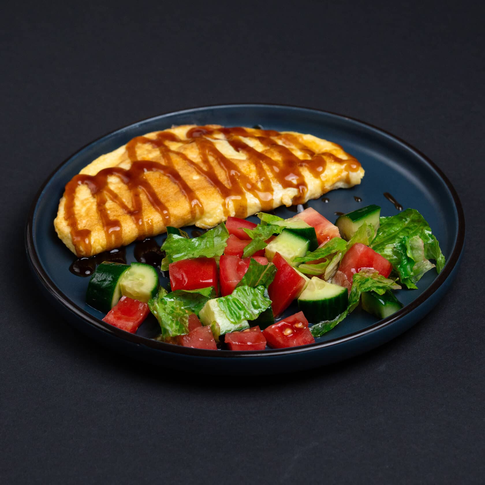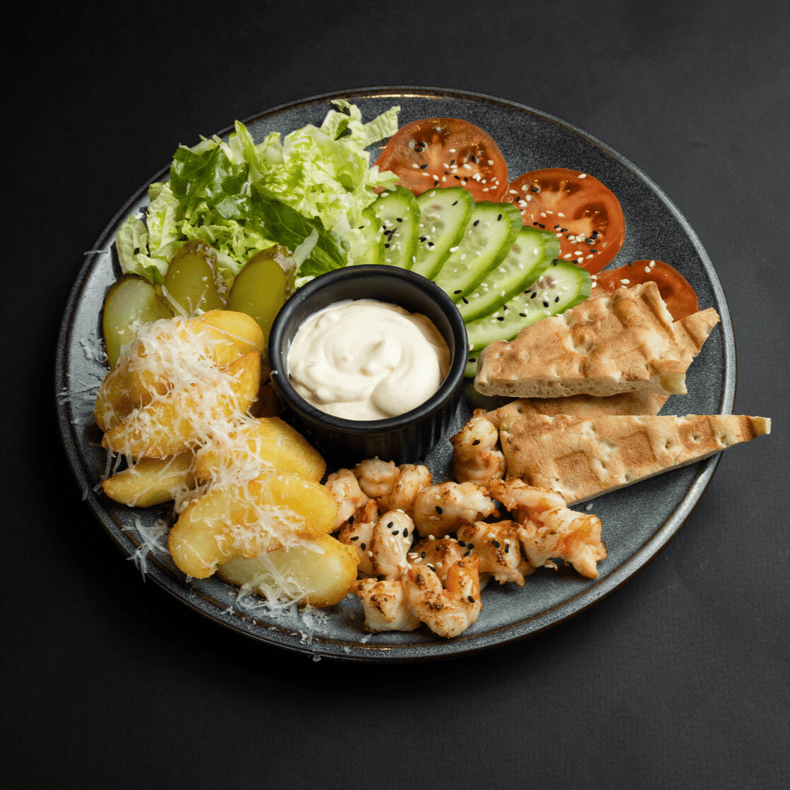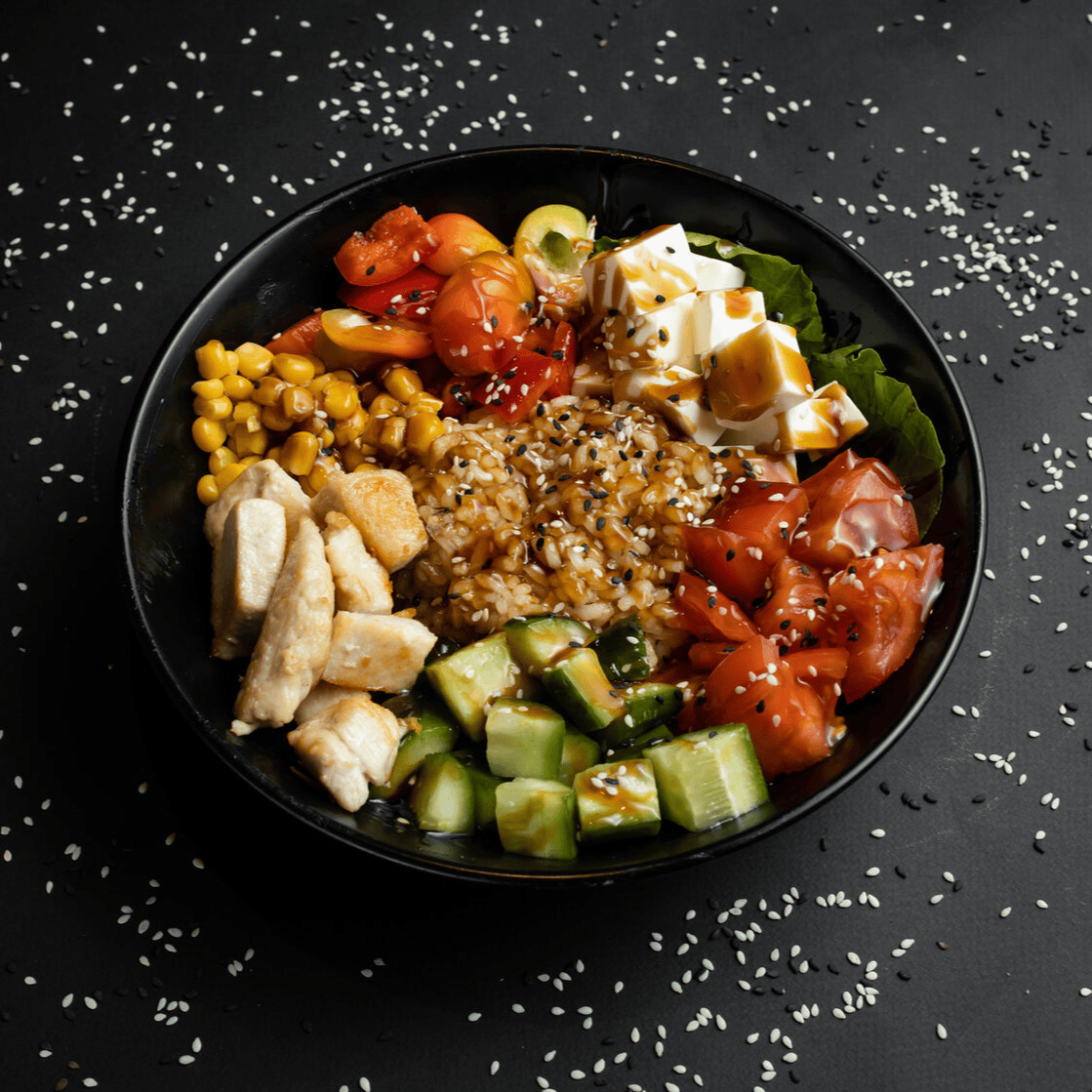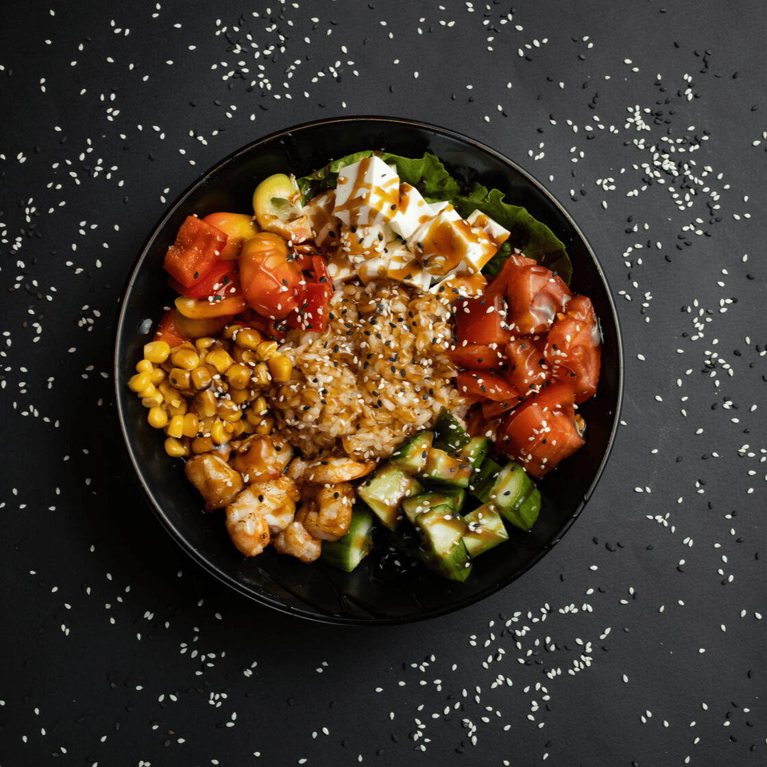 Сбалансированное и яркое блюдо с тигровой креветкой, маринованный редис, помидор черри, огурец, морковь по-корейски, яйцо, рис и грибы шиитаке под соусом унаги, посыпанные кунжутом подается с острым соусом