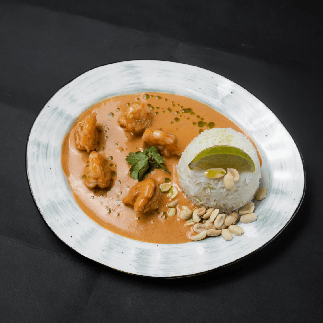 Каррэтоки из рисовой муки с креветками в густом остром соусе.