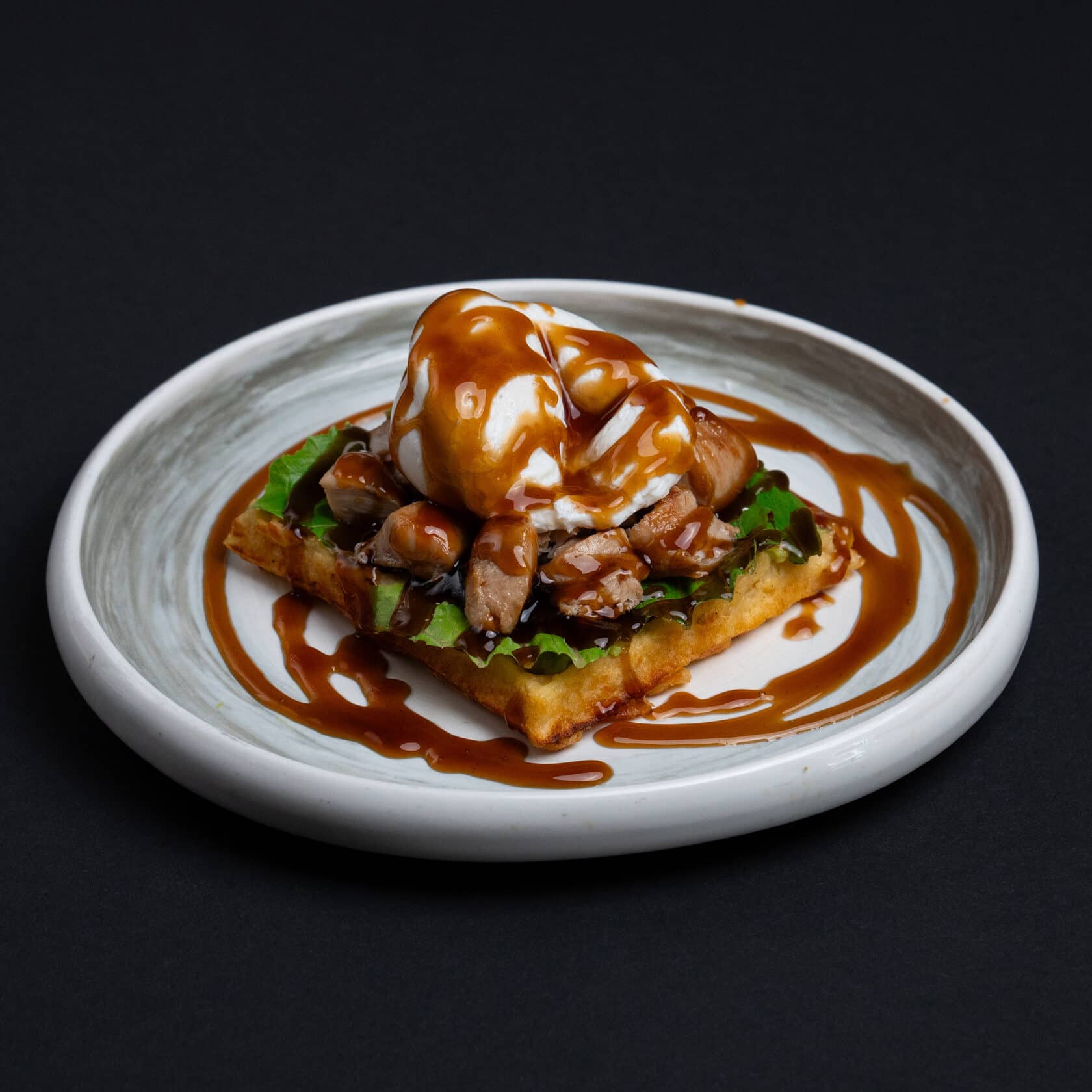 Хрустящие кусочки цыпленка, покрытые глазурью с рисом в кисло-сладком соусе, посыпанные зелёным луком и кунжутом, культовое блюдо корейской кухни