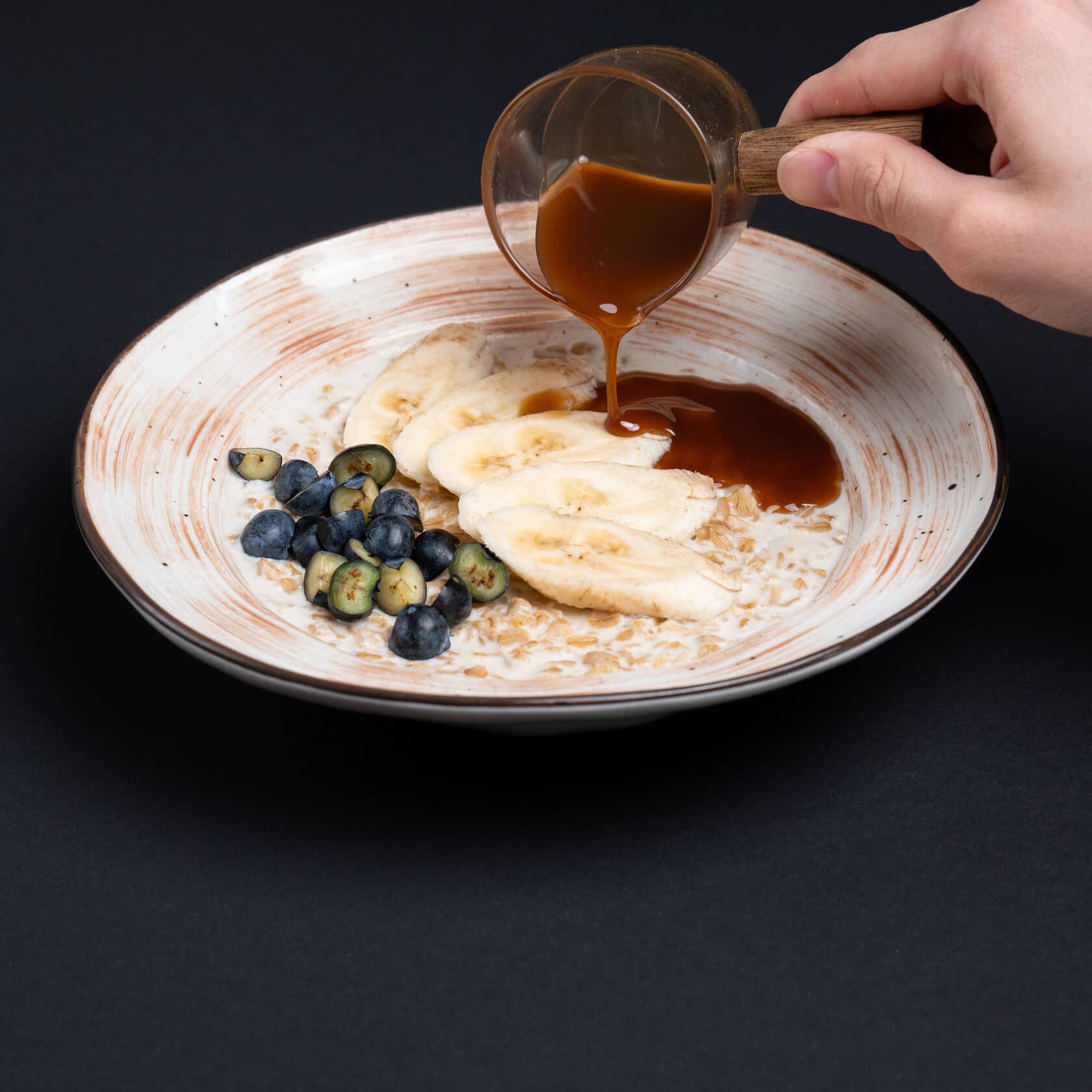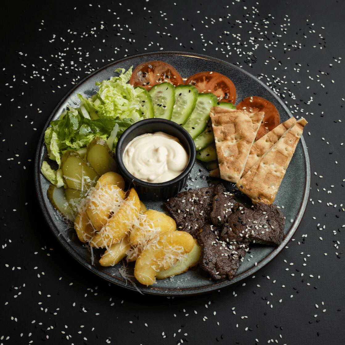 Сбалансированное и яркое блюдо с говядиной, маринованный редис, помидор черри, огурец, морковь по-корейски, яйцо, рис и грибы шиитаке под соусом унаги, посыпанные кунжутом подается с острым соусом