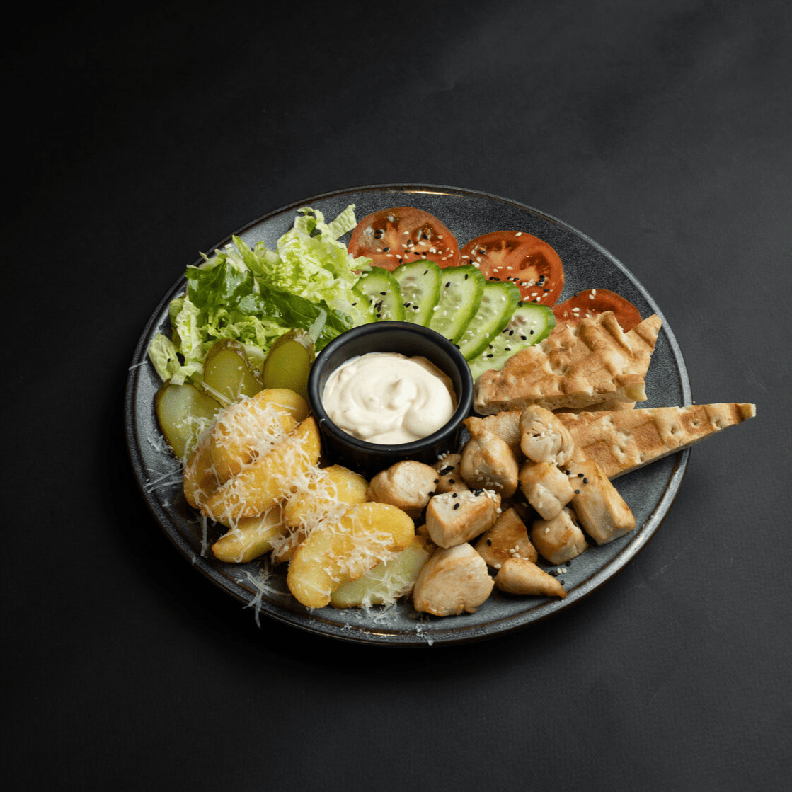 Сбалансированное и яркое блюдо с копчённой курицей, маринованный редис, набор овощей, морковь по-корейски, яйцо, рис и грибы шиитаке подается с острым соусом